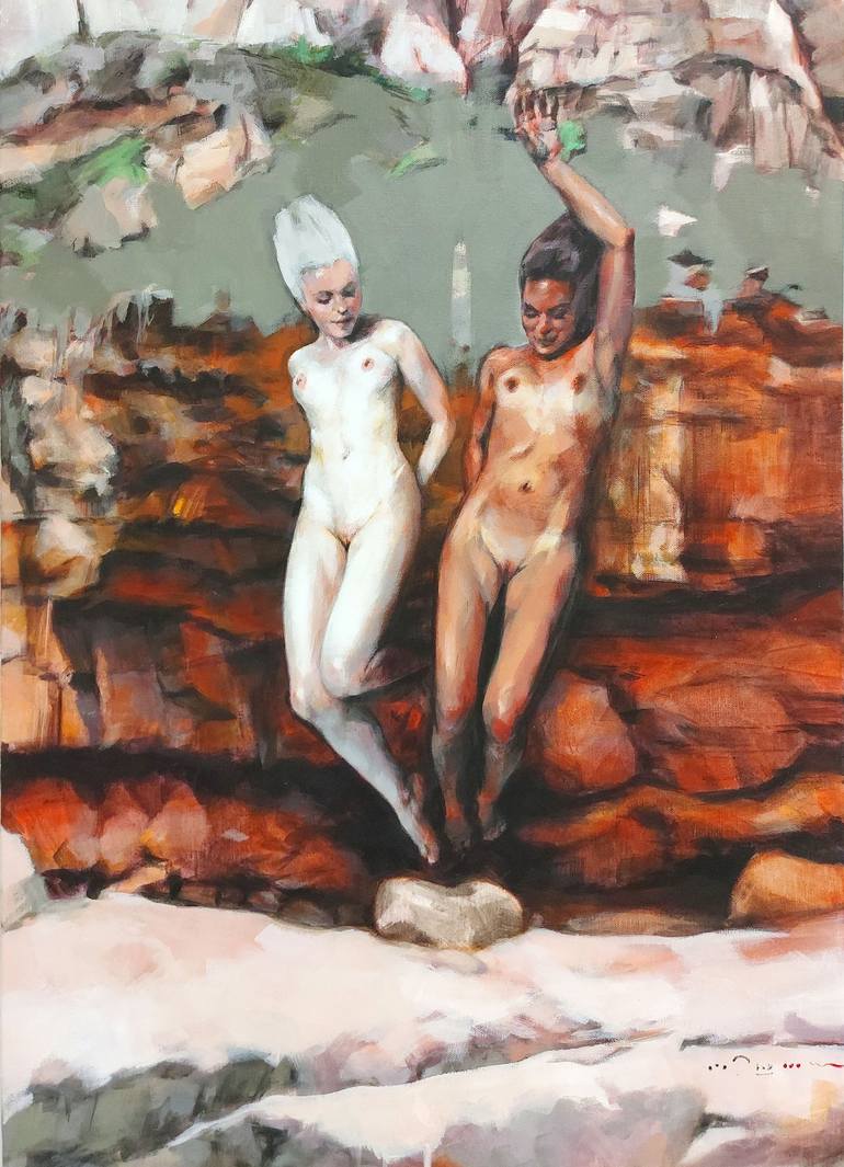 Born in Cagliari, Italy, in 1970. Lives and works in Rome. "A painter is like the sea, it can’t but reflect the Sky" My painting investigates the human figure in relation to the natural environment, focusing on the revelatory quality of this bond through a figurative language that integrates elements of structural tension and dynamic suspension. In my vision, the nude figure is an expression of integrity and individual freedom – a subject that, unburdened by veils or filters, represents the active conquest of one’s own state of being, detached from conditioning and self-censorship. The figures are immersed in natural contexts that vibrate with energy, spaces that host moments of intense manifestation where the scenery acquires an enigmatic and elusive aura, suggesting the realization of something invisible. The work explores the dialectic between the concreteness of paint and the power of the unsaid, placing itself in a dialogue between sensory realism and dreamlike suggestion.
