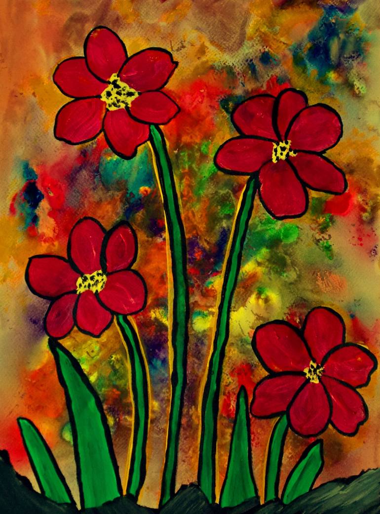 Acrylic and watercolour paint on watercolour paper depicting red flowers growing from a rocky landscape as thunderous clouds gather in the sky above.