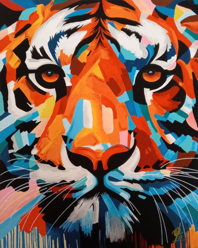 Tiger Painting, acrylic and pastel on framed canvas, Contemporary and pop art style with colorful brushstrokes