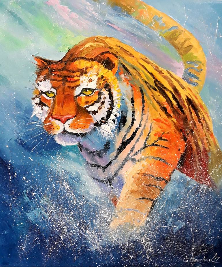 Tiger,oil painting on canvas without frame as edges are painted,100% handmade palette knife and high quality oil ,will decorate your interior for a long time and will give you and your family positive emotions.Ready to hang.Tiger,animal,bright, oil painting,nature,oil,impressionism,interior,gift