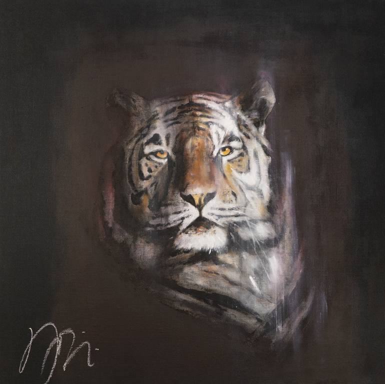 Title of art work "Tiger" mixed media with spray paint Painted on canvas size S15 652mm×652mm unique original Floater wood open back frame (I will frame the work) Ready to hang