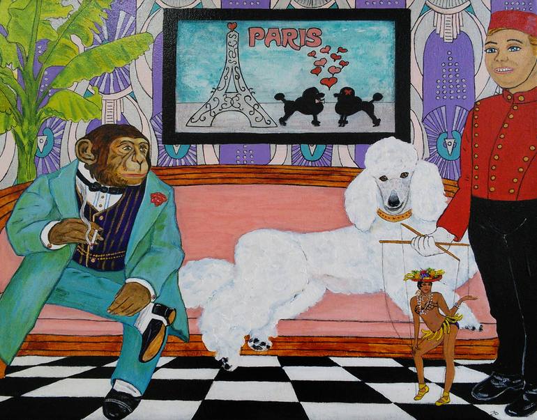 The most important element in anything I create is color and its relationships. My figurative work appropriates and juxtaposes imagery and ideas from American culture. My imagination is stimulated by what I see and hear on the internet. My paintings are sometimes parodies depicting scenes that can be suggestive, ambiguous, and disconcerting. Favorite settings for these scenarios are bathrooms, kitchens and hotel rooms. Common motifs are checked floors, cigarette holders and cigarettes. I enjoy using irrational perspective and color for value. Figures in my paintings are often self-consciously staring out at you the viewer thereby including you in a scenario whose meaning is created in your mind, based upon your unique world/societal perspective. Most of my paintings are small in size and intended for small, intimate spaces. Since receiving a BA in Art from the University of Hawaii-Hilo, my artwork has been exhibited in solo and group shows in the United States; Amsterdam, The Netherlands; Paris, France; London, England; and is in private collections in 50 states and 16 countries. Favorite mediums are oil, acrylic, watercolor, and ink.