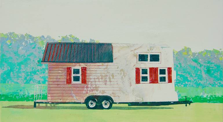 This painting measures 11h x 20w x .875d inches unframed. It’s painted with acrylics on canvas board glued to a wood frame. Like most of my architectural pieces, this painting is about color, light and shapes. The profile of this solitary structure blends into the sky, accentuating the geometric, a...