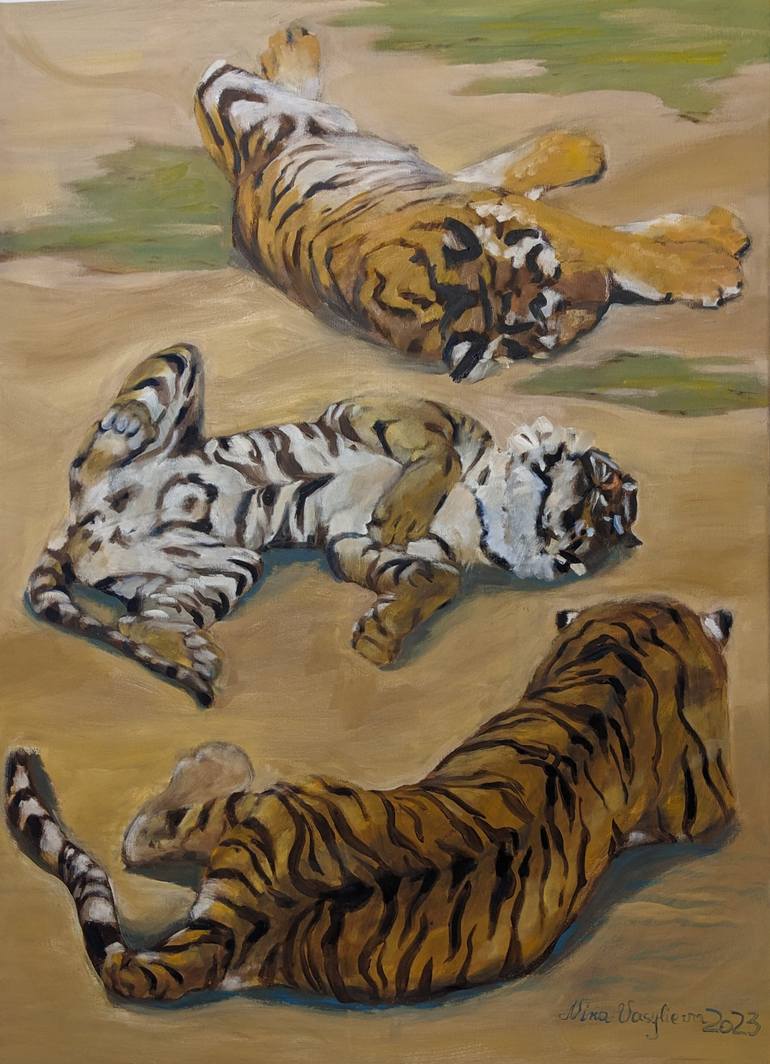 This painting was inspired by the observation of three tigers in Tunisia's Zoo. I always find it adorable, how these big animals and mighty carnivores look like domesticated cats when rested. The painting is painted vertically so it can be hung on a wall with other paintings, to use on your gallery...