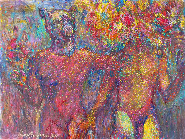 This artwork draws together the opposing forces of physical and spiritual love. Eros is depicted with a handful of flowers, heartily embracing Philia. Philia is passionately touching his companion’s thigh. The brushwork used Pointillism to give the painting an airy, uplifting feel. Our visible ident...