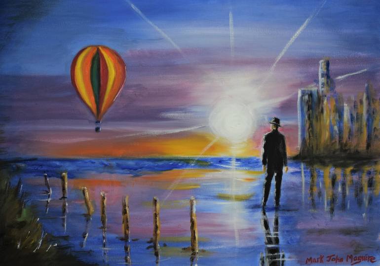 An isolated man watches a colourful hot air balloon from the shore, riding above the sea; the sun is setting on the distant horizon and the colours of the evening set the sky ablaze. The only other signs of humanity are some far-away high rise buildings on the right. The painting invites the viewer ...