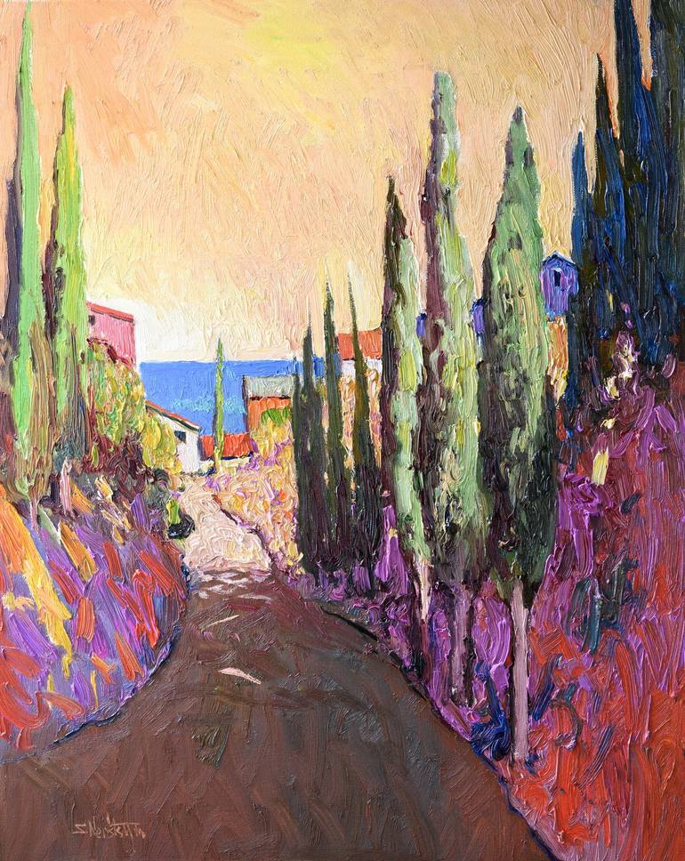 Early Morning sunlight filled the air with creamy shades. Tall cypress trees surround the road to the ocean. The blue of the sea stands out in the composition. Impasto textures brushstrokes and bold colors reflect the warm mood of summer morning. The artwork is on oil-primed canvas, stretched on woo...