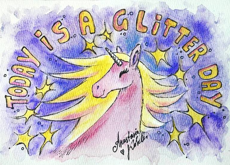 Bring magic into your home with this enchanting, hand-painted watercolor illustration – “Today is a glitter day”! This charming artwork features a whimsical unicorn with playful lettering and sparkling vibes. Inspired by 80s airbrush aesthetics, Roz Chast’s quirky style, mail art, bokeh lights, and ...