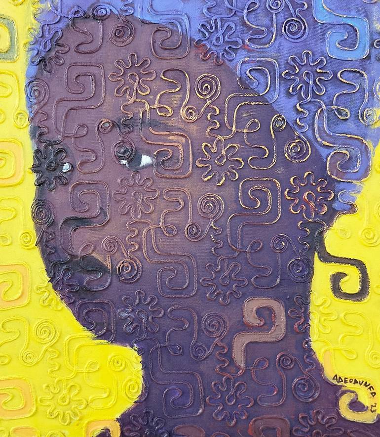 "Tolu" is an evocative representation of introspection and resilience, expressed through vibrant colors and intricate patterns. The portrait's dual-toned background, with rich purple merging into bright yellow, symbolizes the interplay of shadows and light in one's emotional journey. The swirling pa...