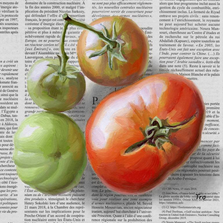 Juicy green red tomatoes, oil painting on newspaper. -Title: Tomatoes -Size: 20 x 20cm / 8x8" -Materials: oil, gesso, newspaper, cardboard, UV protection -The picture is unframed Paintings on newspaper should not be directly exposed to the sun. Picture glass with UV protection is recommended. Due ...