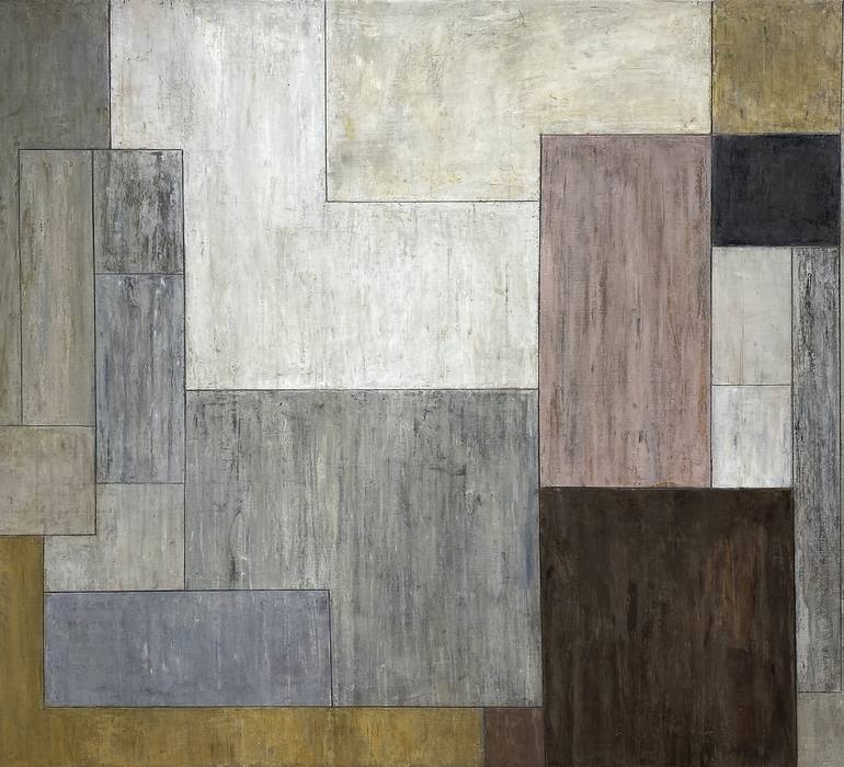 Geometric abstract painting using mostly cool neutral colors. This piece in particular has edgy textures creating a very unique painting. A combination of cold wax medium and marble dust are used with oil paint. The painting continues around the edges and can be hung as is or placed in a floating f...