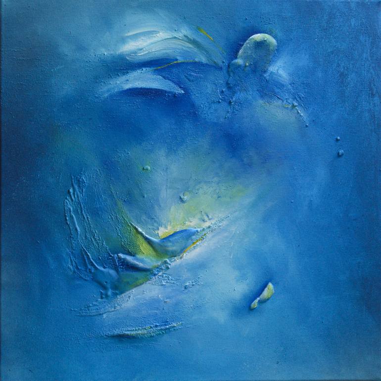 Shades of blue made with oil painting on an acrylic background. The relief created by the concrete seems to let appear animals shapes like a turtle and a bird. Nuances de bleues à l'huile sur fond acrylique. Le relief crée par le béton semble faire apparaître des formes animalières telles une tort...