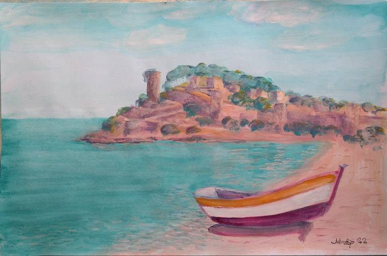 A view of the Tossa de Mar castle with a fishing boat moored on the beach in front of it.