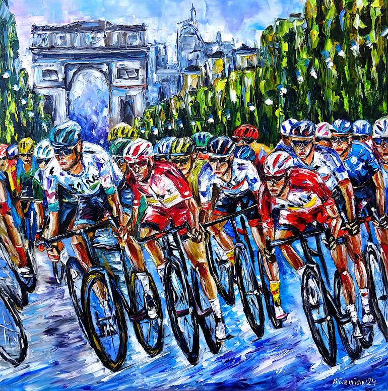 Road cycling scene in Paris. Cyclists on the final stage of the race on the Champs-Élysées. Behind them stretches the Arc de Triomphe. The athletes fight with their last strength for victory. A vibrant racing cyclist oil painting in a square format. Oil painting on canvas using palette knife techni...