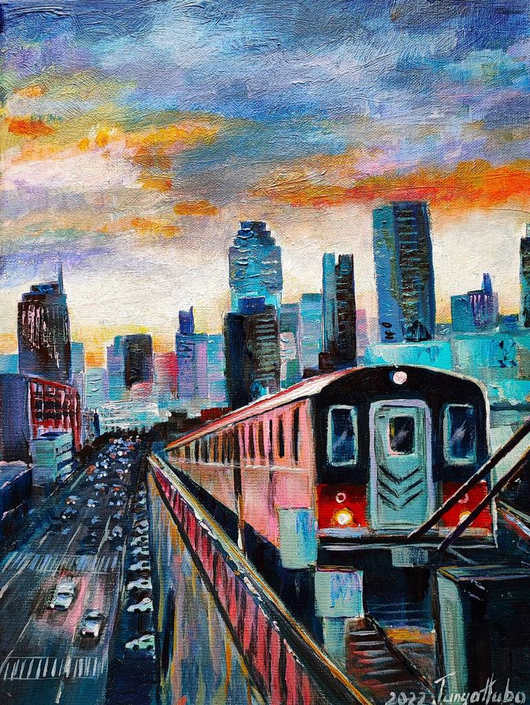 Train Subway bridge original painting on stretched canvas, New York cityscape artwork original fine art paintings, hand-painted, one of a kind size 12 x 16 inches materials: acrylic paint, stretched canvas, brushes The colourful painting will greatly add to your original painting collection. The ...