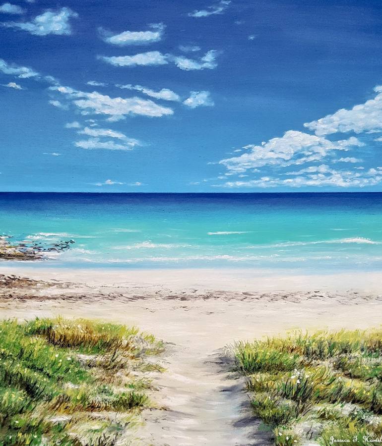 An oil painting trying to capture the tranquility of a beautiful sunny day at the beach. Imagine stepping on to the white sand, hearing the calm ocean waters and feeling the wind and sun on your skin.