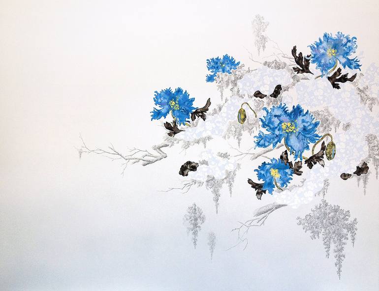 pencil and acrylics on paper. This painting is descended from Kacho-ga (painting of flowers and birds) and Suiboku-ga (ink-wash painting) in Japan. They find value in space itself and arouse infinite imagination. It has a unique Japanese 'ma' culture. He sought to update Japanese art by converting ...