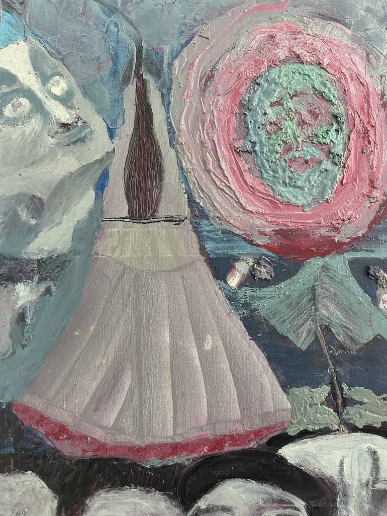This expressive oil painting on canvas transports the viewer into a world of symbolism and historical emotion. The focus is on the upside-down bouquet of flowers, symbolizing the feminine, and the flower on the right, representing the masculine. These two energies seem to dance on people's heads, cr...