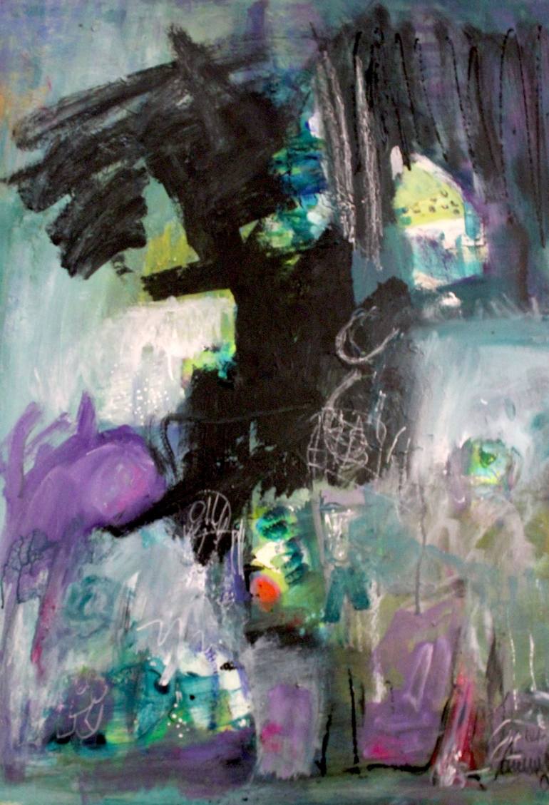 opera su pannello plastificato, olio e acrilico, 70x100, sfondo ricercato con sfumature di colore, il fluido informale determina un energia centrale dove la composizione si propaga in maniera discontinua quasi a fuggire da una regola primaria, trovando un armonia esistente tra segni e tracce.