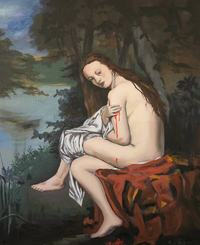 Since 2019, Quentin Liu began to painstakingly copy this painting by Manet to deepen the technique. When the copy was finished, he was inspired by Duchamp's painting, L.H.O.O.Q. and added traces of blood on this woman's arm, adding violence to the picture. Why is she hurt? The artist invites viewers...