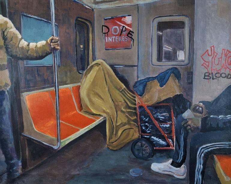 New York City Subway scene acrylic painting entitled "Trickle Down" by Eric Allen Young