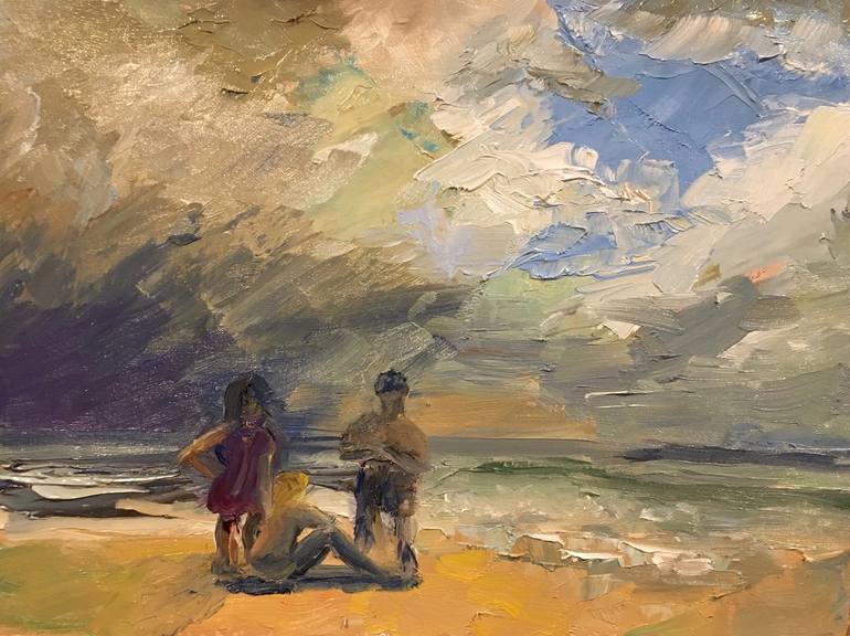 A beach scene, painted from a memory. Oil on canvas mounted on wood.