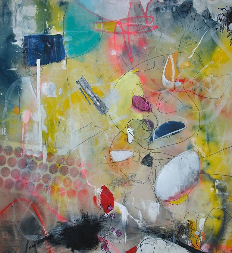 I spent the early part of my childhood in the heat and humidity of the south-Arkansas and Louisiana. The first few years of my education were held in a one room private school (Think of a modern day little house on the prairie school) grades 2-8 with approximately 12 students spread out throughout the grade levels. I skipped kindergarten and first grade, not because I was a child prodigy, but because there was no curriculum for those grade levels. My mom was the teacher and this did not work out very well.We lived on the school grounds in a mobile home (I was not allowed to call it a trailer. My Mom always said a trailer is what you put cotton in.) Because it was such a small school, there was no art class. Somehow I found the materials I needed to create, and that is when a whole world opened up for me. I began my newly found interest drawing triangular cars with huge wheels in the back and tiny ones in the front. The engine or “blower” as I called it was the most important part of the drawing. The bigger the better, even if it was completely out of proportion with the drawing. By fifth grade I was living in Baton Rouge, Lousiana and attending a larger school. My mom was still a teacher and there was no art class at this school either. By the middle of my 8th grade, I was doing poorly in school and so a decision was made to ship my twin brother and I up to Ohio to live with my Dad and attend school there. To my surprise this school had an art program with an actual art teacher and loads of art materials. I had discovered nirvana. I spent every moment I could in the art room creating masterpieces and before I graduated high school, I had decided I would become an artist. My Great Grandma was a painter and my Great Uncle was a photographer so thought it only made sense to follow in their footsteps. I typically work in layers, covering over much of the previous layer as I build new layers. I like the affect of revealing sections of those layers as I work. I have two young kids and love to watch them draw. I have started incorporating some of their drawings into my work. I like the innocence and playfulness the images bring while realizing that duplicating their work causes a forced freedom that comes naturally to them as they create.