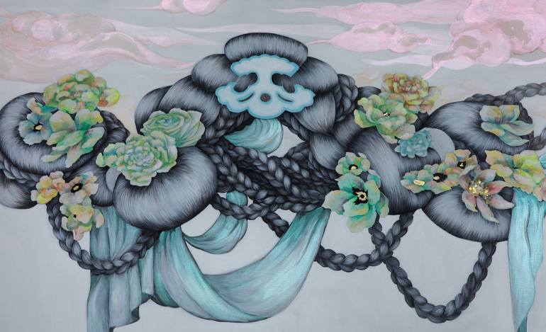 My artworks feature Gache, a traditional wig worn by women during the Joseon Dynasty, which was one of the standards of beauty at the time and also a symbol of extravagance. An anecdote about a woman who allegedly lost her life due to the excessive weight of a Gache highlights how it was both the ob...
