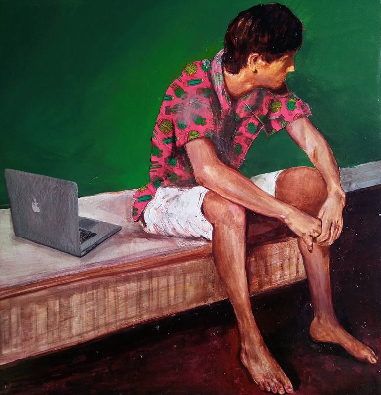 My art life also on Instagram Mennato Tedesco is a very elegant and refined artist who expresses his pictorial inspiration through a style that can be traced back to the "modernist figurative neo-expressionism". Rather attentive to social dynamics, his characters amplify a marked irreverence towards the behaviors induced by consumerism and contemporaneity. The artist often intervenes on the canvas by adding various materials such as plastic, adhesive tape, fabrics etc. which always generate unusual and remarkable effects. Quiet immersion in our own thoughts, a moment of deceleration in an increasingly fast-paced world - with my paintings I want to invite the viewers of my paintings to pause for a while and see that often the power lies in the silence and in the concentration on the little things in life. The gaze of my depicted figures is mostly turned away from the viewer. They are completely absorbed in themselves, are not distracted by anything - hence the monochrome background - can thus dive into another world where stillness is enjoyed. It is the body, and the search for a probable limit, the field of investigation of the young italian artist; through color and unusual perspectives, seems to want to overcome even the limit of the limited space of the canvas, the two-dimensionality, in search of a new dimension that brings the viewer ever closer to the sense of expectation of the movement that is released starting from the human figure. The artist then intervenes on the canvas with the use of wallpaper, lace, ropes, adhesive tape and other materials that always generate unusual and remarkable effects. With his works he is present in numerous private collections in Italy and abroad. Born in Torrecuso -BN- live in Baveno-Verbania- italy