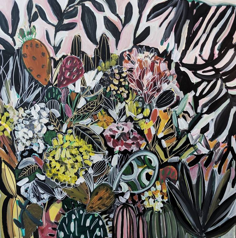I live in Phoenix where I am constantly inspired by beautiful desert landscapes. I find the unique shapes and variety of cactus so charming and wonderful. I love capturing cactus in a luscious abstract style. This piece has a combination of line work and acrylic paint contrasted by structured blooms...