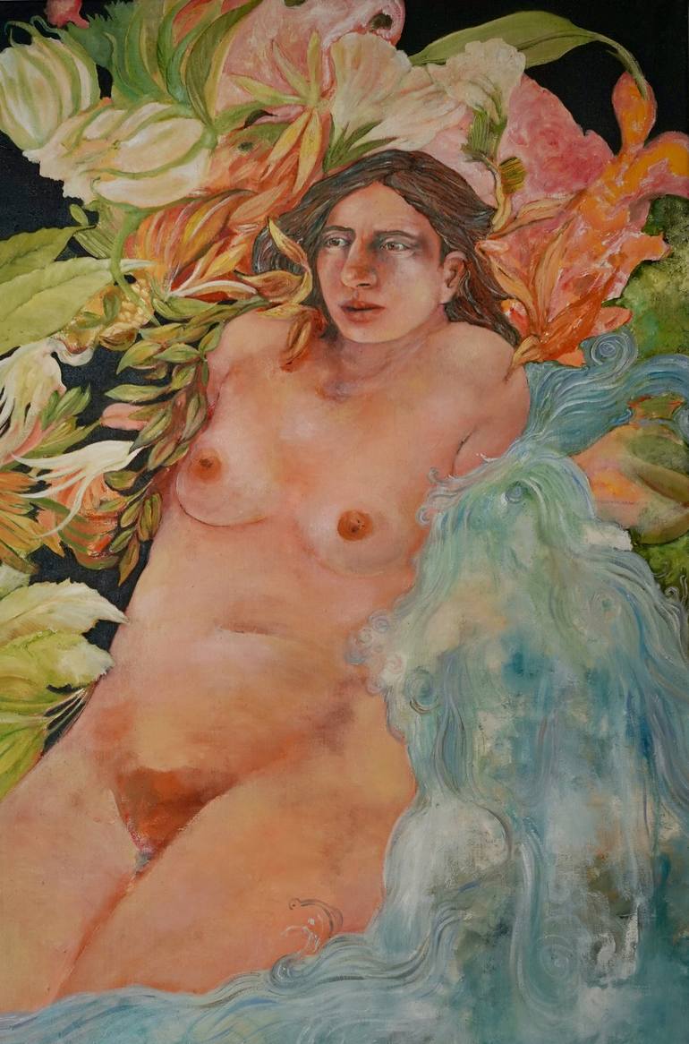 I escape to the heart of a lush tropical paradise. The painting "Tropical Serenity" captures a moment of pure tranquility and natural beauty. Set along the banks of a pristine river enveloped by dense foliage, a woman is bathing in the gentle, crystal-clear waters. She is an embodiment of the tropic...