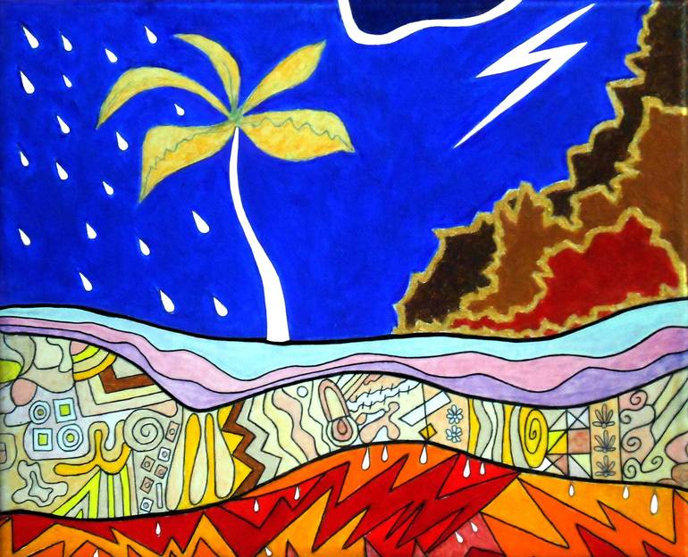 A stylized, or abstract, landscape of a stormy tropical scene featuring a lone palm tree, raindrops, and a lightning bolt. For those of you familiar with my work, this is somewhat of a departure--and an experiment--from my usual subject matter and style.