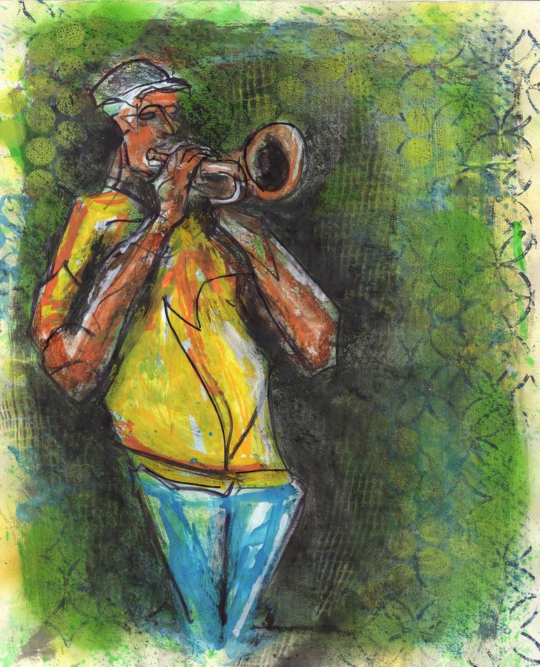 This is from my series of musician paintings. I've been going out and drawing live music in Brooklyn for many years. I carry small handmade sketchbooks in my back pocket and draw simple line drawings, mostly in the dark, so I really don't see the drawing until later. I've been taking those small dr...