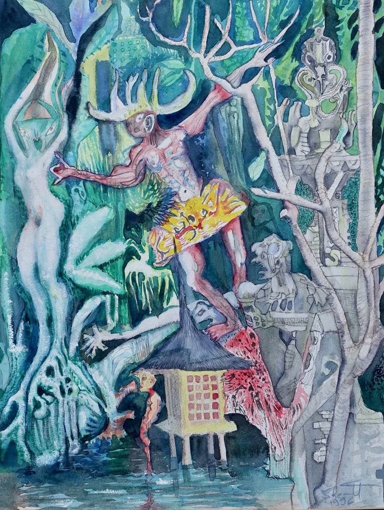 The Balinese myth of ‘Truna Tua and the Sky Nymph’ was the inspiration for this painting in watercolors. The story appeared in a different context in an earlier work of the same year, ‘Eye Of God’, 1996. One the most popular stories among Ubud traditional painters, this myth gives them an opportuni...