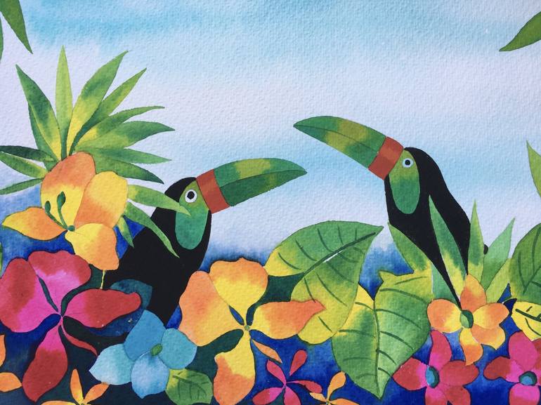 n this vibrant watercolor artwork, a majestic toucan takes center stage against a lush tropical backdrop. I skillfully capture the toucan's striking, oversized beak, which boasts a vivid array of colors ranging from deep sapphire to brilliant emerald. Liquid watercolor on watercolor paper.