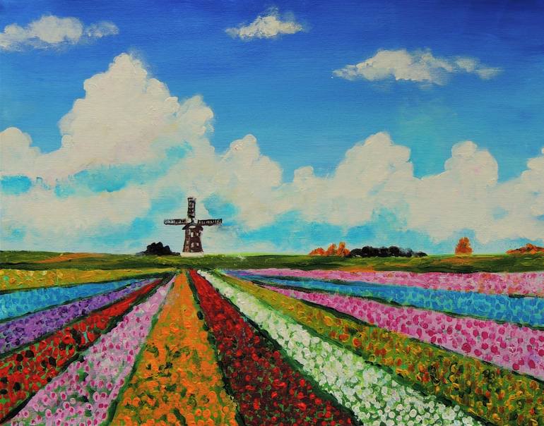 Tulip in bloom in April and May in Netherlands is a spectacular sight and treat for your senses. I have painted a Tulip Field in full bloom in late April in Holland with a classic windmill.
