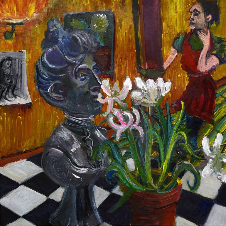 I love going along to art classes and painting the students/artists (or other backgrounds) along with the still lifes. I hope I have slightly conveyed the wiggling movements as the painter goes at it!. Thick acrylics applied all in one go. Not sure why I didn't upload this one before.