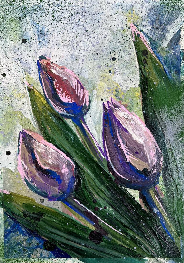 Beautiful impressionistic textures ''TULIPS ON WHITE ''. Artwork will be Bright accent in interior . Certificate of Authenticity attached. Signed. ABOUT THIS PAINTING Size: 25,3 x 17,5 cm Acrylic painting on cardboard. Material : High quality professional acrylic paint on paper. Covered with a go...