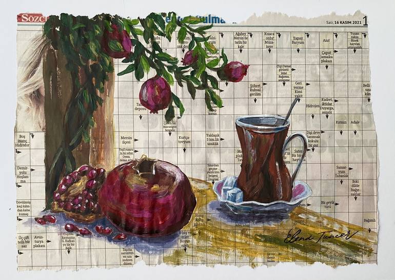 An original acrylic painting of Turkish tea with pomegranate still life. This artwork captures the rich tradition of Turkish tea culture, featuring a vibrant tea glass with a warm, deep red hue that echoes the richness of pomegranate. The detailed acrylic strokes bring warmth and authenticity, ma...