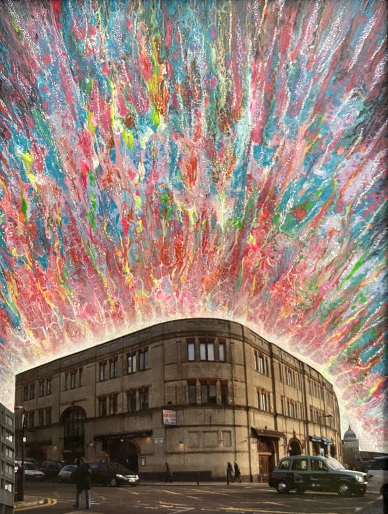 The Turnmills building was a warehouse in the London Borough of Islington that became a bar in the 1980s, then a nightclub. The building was demolished in 2011. Made of recycled materials: reused wooden panels, discarded wall paint leftovers, paper cut-outs of digital images treated with acrylic re...