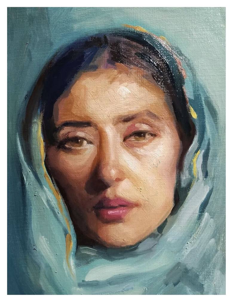 "Turquoise Dreams" is an evocative oil painting inspired by the ethereal beauty of Manisha Koirala, capturing the essence of an Indian woman adorned in a vibrant scarf. The composition centers around her face, highlighting her deep, soulful eyes that seem to hold a world of stories and emotions. The...