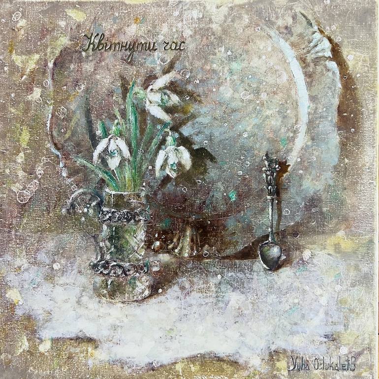 An elegant still life with snowdrops that celebrates the quiet awakening of spring. Symbolizing renewal and gentle beginnings, delicate snowdrops bloom in an exquisite glass vase — surrounded by vintage treasures: a silver spoon, an antique plate, and a lace tablecloth. The composition gently whi...