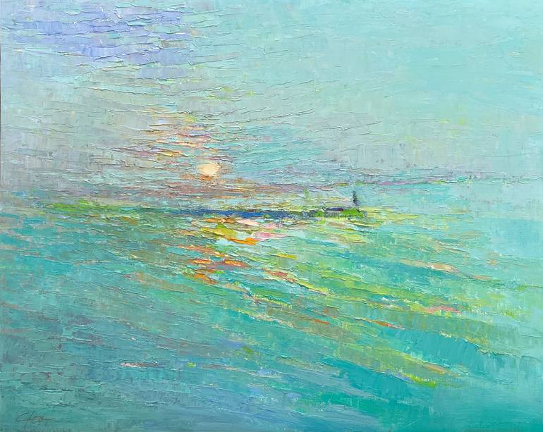 A peaceful morning along the Long Island shore in Connecticut. Every sunrise is different. In this painting, I emphasized the greens, blues and turquoise colors I observed. Like the Impressionists Claude Monet and J.M. Whistler, I added orange, pink, yellow and lavender to compliment the blues and ...