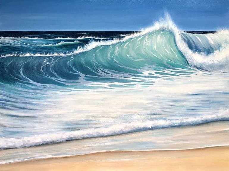 My recent work has been focused on the changing colours of the sea and childhood memories of holidays to the Mediterranean and annual visits to Torquay (before the M5 was built). These emerald and turquoise waters, have all had an influence on what I wanted to paint recently. Having moved to Devon 15 years ago the coastline and seas around Devon and Cornwall still inspire my work. I have been painting a series of wave paintings for over 5 years now. It is the light coming through the waves and again the colour of the water that I am keen to explore. Everyone sees colour in a slightly different way to one another, call it colour perception. The way I see colour and the feelings I get when the colours align well on a canvas is appeals to me. The way collectors see my work will be unique to them because of their own individual colour perception. Studying film and video art at the University of Plymouth has impacted on the way I paint. I like to include a sense of movement in my work and a sense of escapism. I want the viewer to feel they can walk across the sand or dive into a turquoise sea. This second series of paintings looks at the play of light on water. It is a more tranquil and peaceful contrast to the wave series. It examines shallow turquoise and emerald seas. I am intrigued the patterns created when sunlight hits the shallow water creating a dance of light and shadow with blue, turquoise, green and indigo ripples.My paintings are oil on canvas as I prefer to work with this medium for its adaptability. In my work I aim to incorporate a process of change and development. For instance saturated elements are left to dry on the canvas changing over time. Only after a period of waiting the eventual image can be resolved. I apply glazes to further enrich the surface of the work. It is important to me to revisiting a painting several times until I am completely satisfied with the texture and depth of colour in the finished painting.I graduated with a BA (Hons) in Fine Art in 2008 at the University of Plymouth. I have exhibited my paintings throughout Devon and gained an award at the Exeter Short Film festival. My films and photographs have been exhibited on the South Bank, London and in Italy. I have recently been given ambassador artist status for the UNESCO Torbay Geopark.I admire the wave paintings of Maggi Hambling. Her free use of thick impasto paint and large gestural marks on the canvas has inspired me to free up my mark making too.