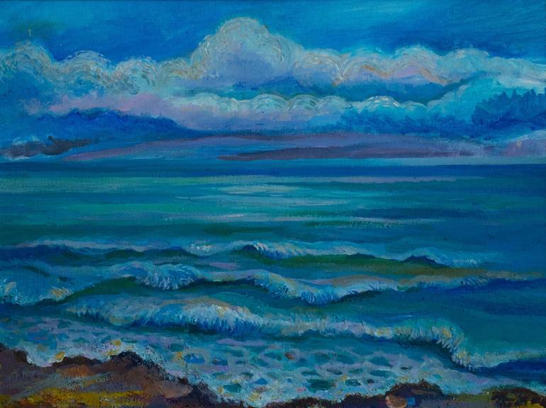 Landscape of the high-mountainous Issyk-Kul lake, in turquoise-blue tones. Low clouds in lilac hues create a mood of fresh wind, which plays with waves.