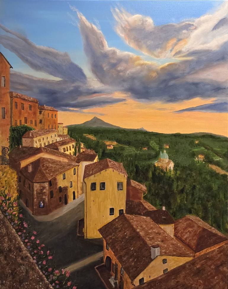 Inspired by first visit to Italy after 3 cancellations for covid. We rented an apartment in Montepulciano for a week and walked every inch of the town and countryside. I took thousands of photos and this painting is a combination of 3 of those photos. I'm glad that I waited to paint Italian scenes u...
