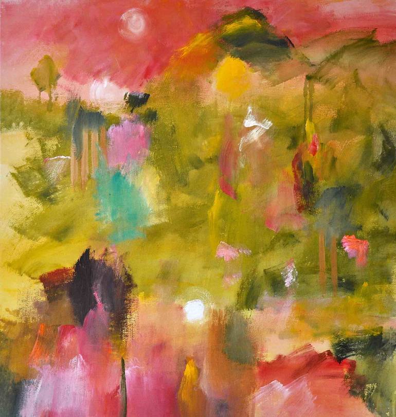 "Tuscan Hillside" is an abstract painting completed plein-air in Italy, during an Artist Residence in Greve in Chianti. The work is completed with lovely paints supplied by Zecch Colori, the famous Florentine artist paint manufacturer. The rose reds and olive greens are striking in contrast.