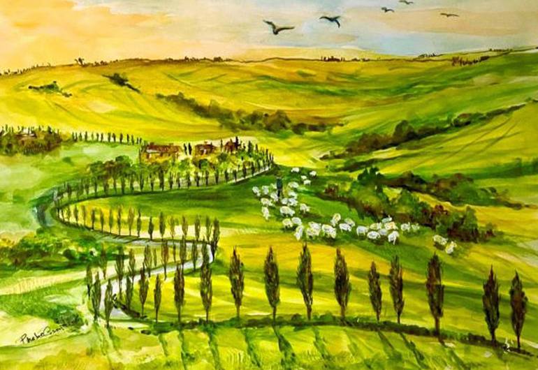 I was inspired to paint this watercolor landscape when travelling in central Italy to visit the Banfi Castello and winery. I was impressed by the tranquil and peaceful scene and the varied colors of green on the hills. I wanted to capture the color harmony in the reflection of the sunset on the hill...