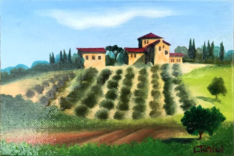 Oil on canvas applied on a small wooden board, with painted edges. Typical Tuscan countryside with hill with olive grove and old farmhouses. Small painting perfect as a gift idea, souvenir of Italy, or to give a touch of Italian beauty to a corner of the house. Needs frame Come with signed certifi...