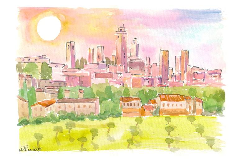 Tuscany Sunshine over San Gimignano impressive Skyline - watercolor on paper